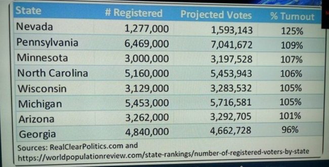 Во всех случаях для графы «число зарегистрированных избирателей» брались данные 2018 года. В США гражданин для того, чтобы получить бюллетень, должен зарегистрироваться как избиратель в каком-то штате. Поскольку выборы 2020 года привлекли огромный интерес, в период между 2018 и 2020 годом во всех штатах зарегистрировалось огромное число новых избирателей. Сколько их было на самом деле в 2020 году, можно посмотреть здесь. Если сравнить с реальными цифрами зарегистрированных, то ни в одном штате превышения 100% не было.