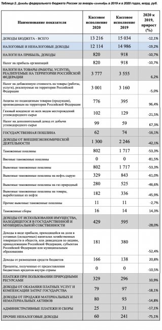 Что касается доходной части федерального бюджета, то за первые 9 месяцев 2020 года она оказалась на 12% меньше, чем годом ранее. Это примерно соответствует темпу снижения ВВП и, соответственно, доходной базы. Но разные составляющие бюджетных доходов снизились неравномерно: то, что касается нефтегазовых доходов, сократилось резко, а все остальное — не очень.