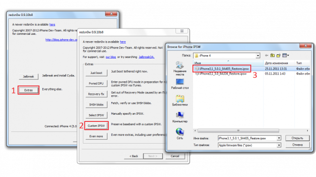 - скачайте желаемую прошивку и последнюю версию утилиты Redsn0w;