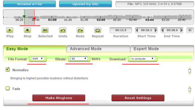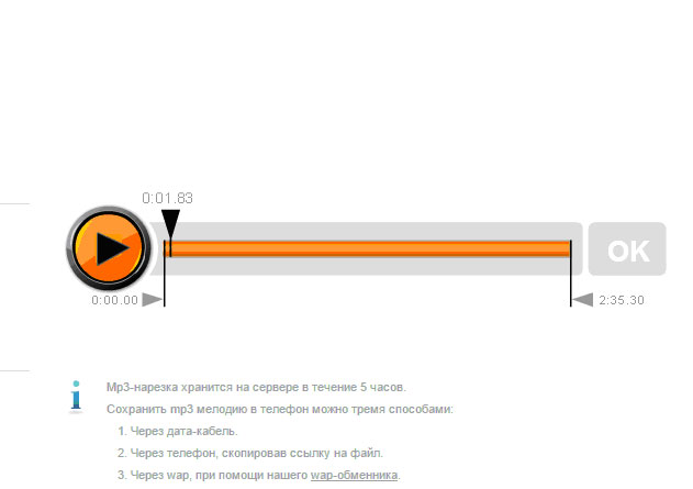 MP3 Maker online-сервис для создания рингтонов для iphone. Сервис довольно прост в использовании: достаточно загрузить обыкновенный mp3 файл и произвести его редактирование. Также на сайте сервиса можно найти достаточно подробную инструкцию, как необходимо вырезать фрагменты из трека и как скачать готовую мелодию звонка.
