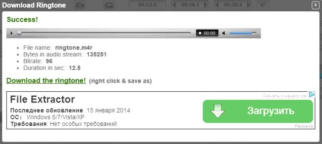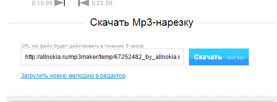 - затем появится окно, где будет представлена ссылка на скачивание готового рингтона.![]() Фото: скачивание нарезки