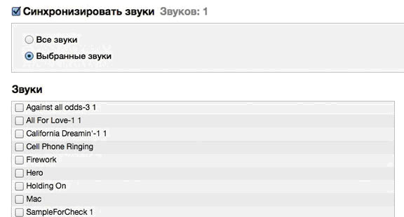 - затем необходимо перейти во вкладку «Звуки» и отметить пункт «Синхронизировать звуки»;![]() Фото: вкладка «Звуки