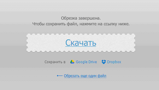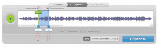 - после того, как нужный файл был выбран, на странице появится окно, где можно обрезать файл до нужного временного интервала, а также добавить плавное начало и затухание в трек;Фото: редактирование трека
