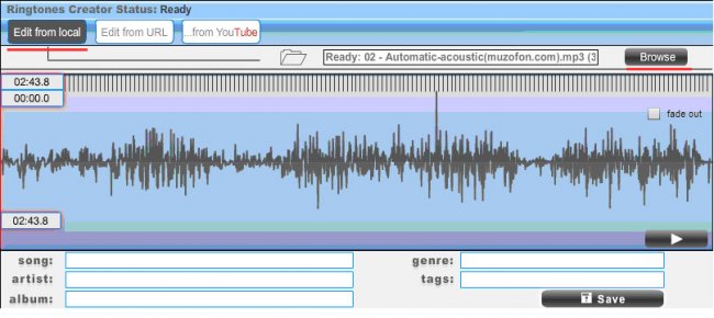 - затем необходимо кликнуть на вкладку «Editfrom Local», и далее щелкнуть на «Browse», чтобы выбрать нужный трек;Фото: загрузка трека
