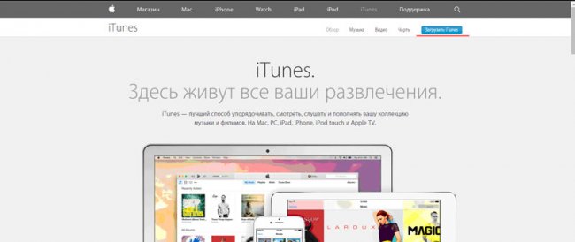 - если itunesне установлена на компьютере, ее необходимо скачать, перейдя по этой ссылке http://www.apple.com/ru/itunes/. Перейдя на страницу программы необходимо кликнуть на вкладку «Загрузить iTunes» и начнется процесс загрузки. После того, как программа загрузилась, ее необходимо установить;Фото: загрузить iTunes