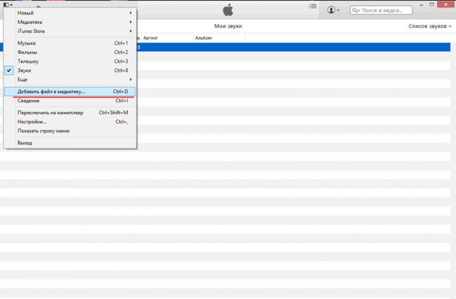 - теперь необходимо запустить iTunesи добавить нужный трек в медиатеку. Чтобы добавить трек в медиатеку, необходимо кликнуть на «Добавить файл в медиатеку»;Фото: добавить файл в медиатеку
