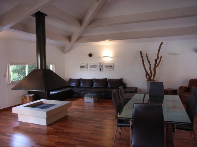 - Отлично смотрится современный камин в интерьере гостиной, спальни или столовой, где топку можно оборудовать приспособлениями для приготовления пищи на открытом огне.