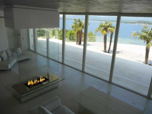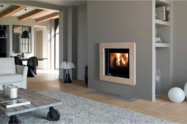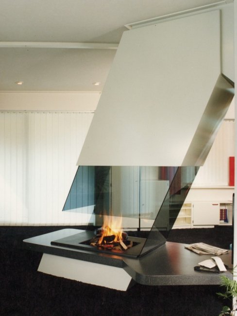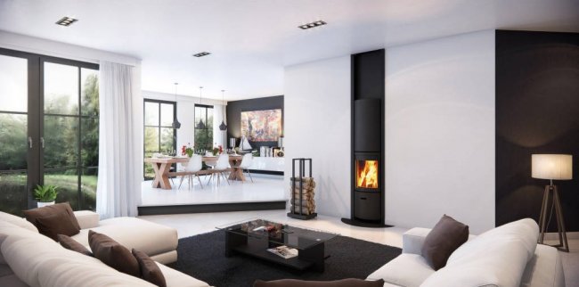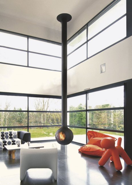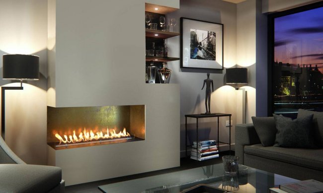 Эффектнее всего смотрится с панорамной открытой или закрытой топкой, позволяющей любоваться горящим огнем со всех сторон.