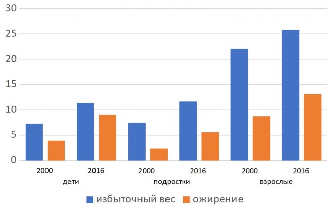 Рис. 2 Рост избыточного веса и ожирения в мире, %