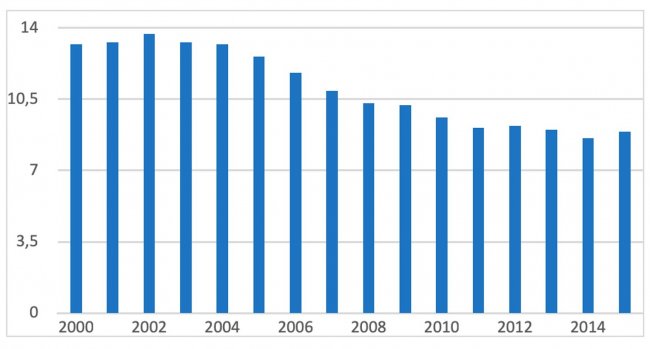 Рис. 3. Достижение Цели развитии тысячелетия №1 до 2015 года : Процент голодающего населения в мире