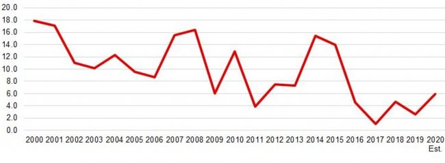 Посмотрим, как обстоит ситуация в России. На Карте голода (Рисунок 4) и на карте Глобального индекса продовольственной безопасности (Рисунок 5), как мы видим, Россия не является страной риска с точки зрения продовольственной безопасности. Даже в условиях пандемии голод в стране маловероятен. Более того, сельское хозяйство даже вырастет в этом году больше чем на 4%, и это на фоне рецессии в экономике в целом. Говорить о дефиците продовольствия в стране не приходится (в течение года возникали отдельные региональные перебои с некоторыми товарами, как например, с овощами на Дальнем Востоке в связи с закрытием границы с Китаем, но это были кратковременные эффекты).
