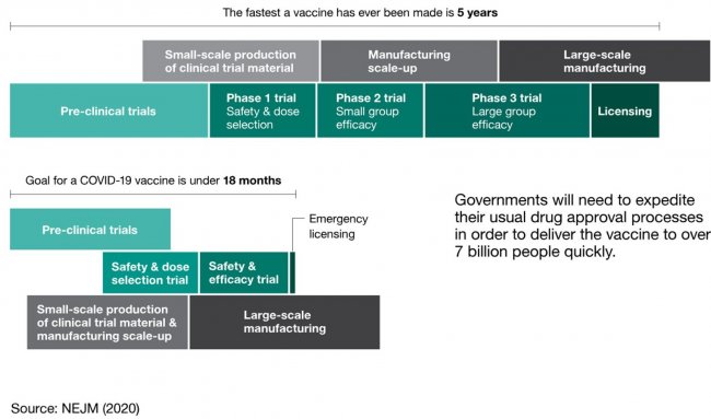 Обычный процесс разработки вакцин (вверху, минимальный срок 5 лет) и во время пандемии коронавируса (внизу, срок 18 месяцев).
