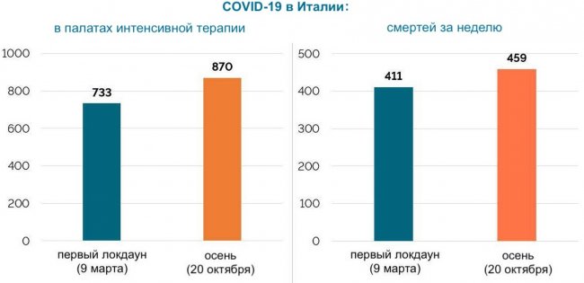 14 сентября в Италии открылись школы (до лета они работали в удаленном режиме), а с 8 октября число больных начало экспоненциальный рост. 15 октября число больных побило мартовский рекорд и с тех пор обновляет его каждый день, но опасения вызывает не это. Само по себе число больных сильно связано с числом тестов: сейчас их делают более 160 тысяч в день, поэтому выявляют инфицированных гораздо лучше. Выявляют и изолируют, что и оставляет надежду на стабилизацию ситуации. В палатах интенсивной терапии сейчас 750 человек против более 4000 в марте, госпитализированы — 7000 против 29 000. Однако фаза экспоненциального роста такова, что это преимущество можно растерять в считанные недели. Сейчас число госпитализированных удваивается за две недели, так что если страна не переломит ситуацию, то вернется к ситуации коллапса системы здравоохранения уже в конце ноября — начале декабря.