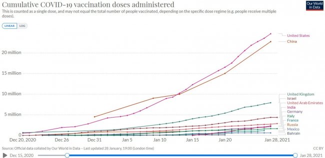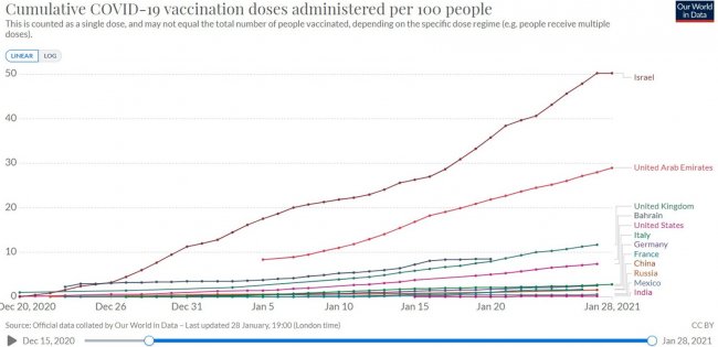 По состоянию на 28 января в мире уже введено более 80 млн доз вакцин от коронавируса. На первом месте по абсолютному количеству – США, затем Китай и Великобритания, но если смотреть в расчете на население, то в лидерах Израиль, где первой дозой привили уже более 40% населения (и уже имеются первые признаки эффективности!). На втором месте ОАЭ, на третьем Великобритания, а США только на четвертом, там привито пока меньше 8%. К сожалению, хотя вакцинация в России стартовала с начала декабря, в стране привито менее 1% населения.