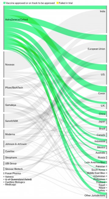 С разворачиванием вакцин в мире дела обстоят не очень хорошо. Как и ожидалось, проблемы масштабирования и логистики приводят к пробуксовкам у всех производителей. У Bloomberg есть прекрасная инфографика, показывающая, сколько различные компании обязались поставить вакцин разным странам.