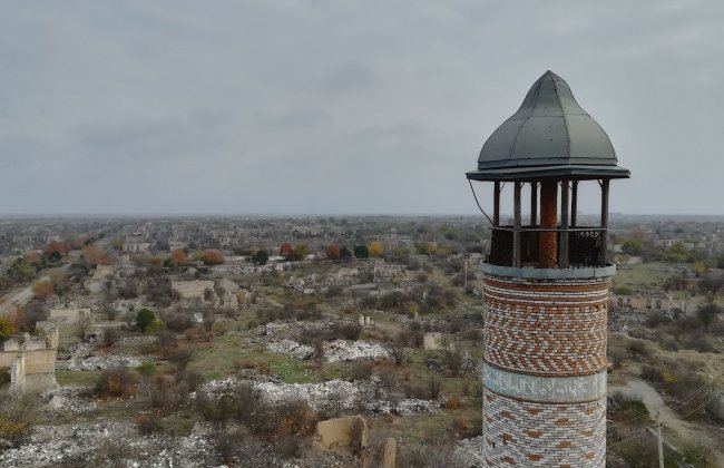 Останавливаемся возле главной достопримечательности когда-то 28-тысячного Агдама - мечети 1870 года постройки. С минарета открывается вид на город, вернее, на его руины. Но фотографий отсюда множество: с 1994 года журналисты много раз приезжали сюда с армянской стороны. На деревянных перилах выцарапаны автографы на армянском, этим никого не удивить. Через дыры в крыше можно разглядеть молельный зал - там прямо на земляном полу военные расстелили коврики.
