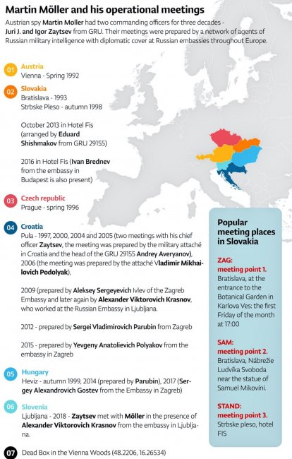 Оперативные встречи Мартина Мёллера в 1992-2018 годах, схема составлена газетой Dennik N