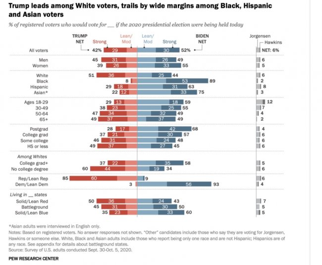 Демографически избиратели Трампа и Байдена отличаются примерно так же, как отличались избиратели Трампа и Хиллари Клинтон. Трампа предпочитают белые пожилые наименее образованные мужчины. Только треть избирателей с высшим образованием готова поддержать Трампа, а среди темнокожих американцев его уровень поддержки — 8% (что неудивительно, если вспомнить, как Трамп даже во время дебатов в ответ на прямо поставленный вопрос отказался критиковать сторонников теории превосходства белой расы). Среди американцев до 30 лет его уровень поддержки составляет лишь 29%.