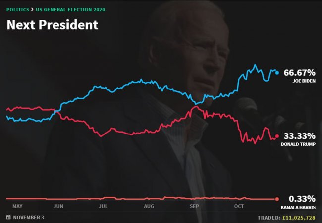 Одна из крупнейших площадок — Smarkets — уже заключила пари на 11 млн фунтов, и судя по ставкам, шансы Байдена оценивались существенно выше все лето, затем сравнялись с Трампом 1 сентября, после чего Байден снова рванул вверх и теперь лидирует с результатом 66% против 33%.