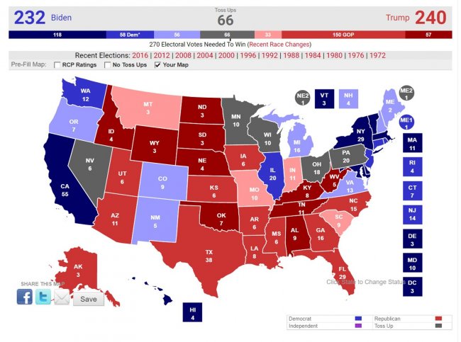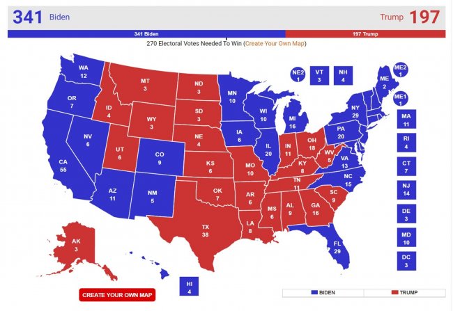 «В розыгрыше» остаются очень крупные штаты — в первую очередь, Техас (38), Флорида (29), Пенсильвания (20), Огайо (18) и Северная Каролина (16). И если взять последние результаты опросов по штатам и заполнить «серые зоны», то кажется, для Байдена все выглядит очень хорошо, он побеждает с разгромным счетом — 341 против 197 выборщиков.