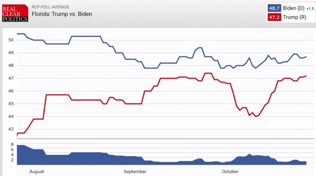 Во Флориде Байден пока впереди Трампа, но отрыв несколько сократился и сейчас составляет уже полтора процентных пункта, это близко к погрешности опросов: