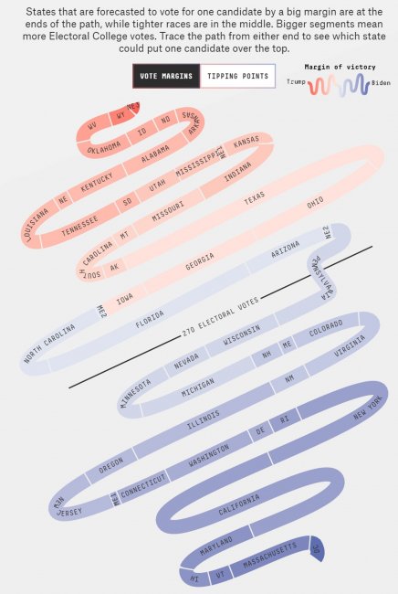 Для победы на выборах нужно набрать 270 голосов выборщиков, и уже можно быть уверенным, что Байден наберет не менее 232 в основном за счет Нью-Йорка (29 голосов выборщиков), Калифорнии (55), Иллинойса (20), Мичигана (16), Нью-Джерси (14), Вирджинии (13) и Вашингтона (12). У Трампа пока набирается 125 голосов, и это в основном небольшие штаты в центральной части США — Индиана (11), Миссури (10), Южная Каролина (9) и другие.