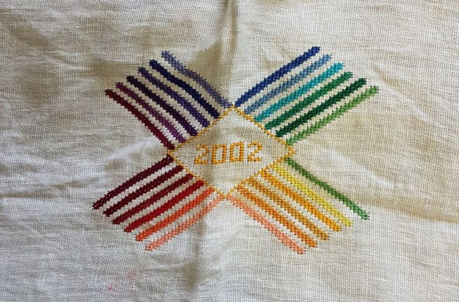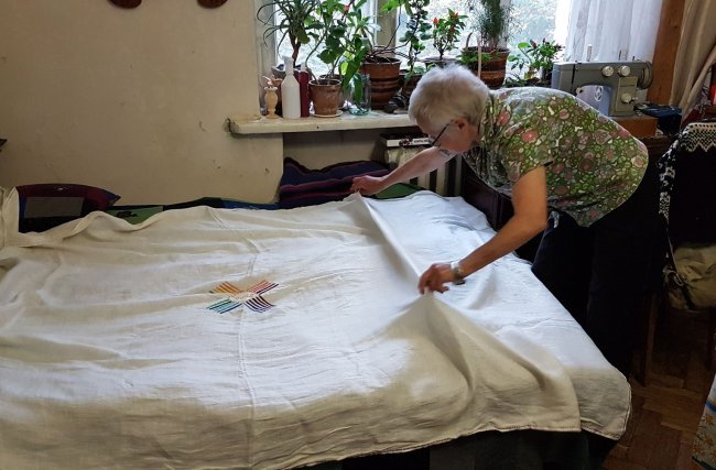 Да, мне о ней еще весной внучка напомнила. Я начала ее вышивать в 2002 году, в центре – символ солнца, вся вышивка – в цветах радуги. Кроме скатерти, есть еще салфетки – на каждой звезда, как символ человека. Только я не все еще вышила. Такие же звезды я хочу нашить на скатерти. Хочу, чтобы мои дети, внуки и правнуки застилали ею стол на свадьбу. Я очень люблю шить, хотя с такими пальцами это становится сложно. Но когда я шью, то успокаиваюсь. Это моя отдушина. Но я пока скатерть так и не дошила, поэтому и власть не сменилась. Каюсь.