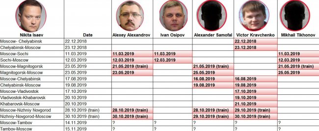 Судя по анализу передвижений известных нам отравителей из ФСБ, следовать за Исаевым начали во время его поездки в Челябинск в декабре 2018 года. Сопоставляя данные из базы перелетов с известными нам поездками Исаева, о которых он писал в соцсетях, мы нашли 7 совпадений по городу и дате поездки (не считая его последнего визита в Тамбов), причем, скорее всего, пересечений было больше, если учесть неполноту базы перелетов, имеющейся в распоряжении Bellingcat. В бригаде, работавшей по Исаеву, были два отравителя, которые известны по покушению на Навального — Алексей Александров и Иван Осипов (оба с медицинским образованием).
