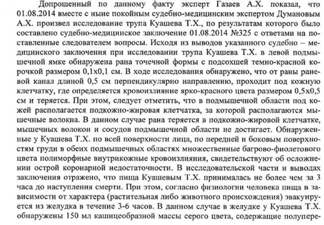 А вот еще интересный момент. В постановлении о прекращении уголовного дела говорится, что в день смерти на телефон Куашева поступили две СМС с сервисного номера «Мегафона» (то есть с номера СМС-центра), причем установить содержание таких СМС, согласно ответу «Мегафона», якобы технически невозможно.