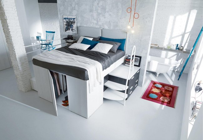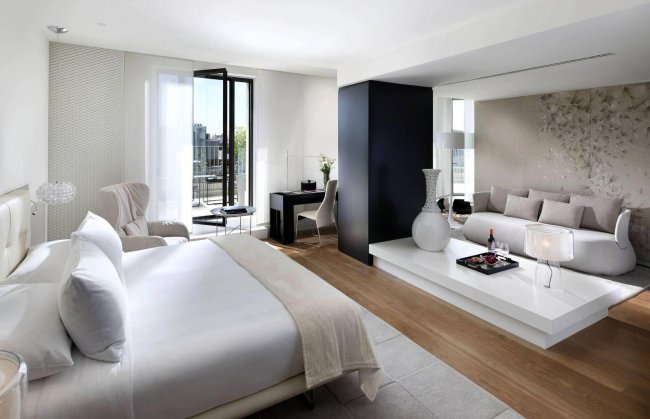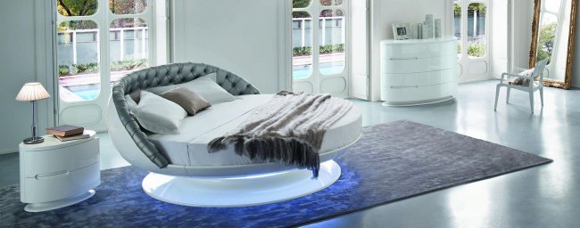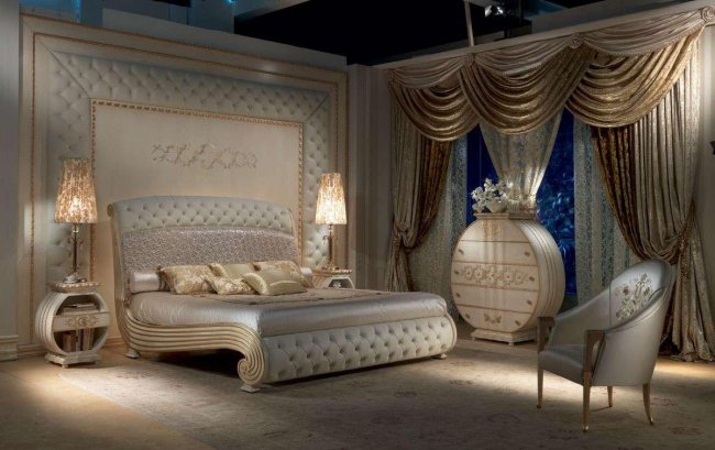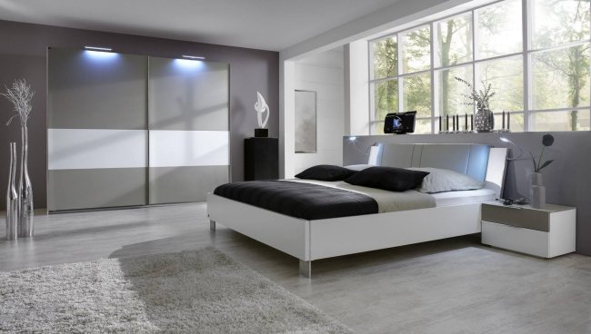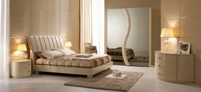 Интерьер спальни со светлой мебелью носит черты минимализма. Комната должна вмещать минимум предметов и больше отражающих (глянцевых, зеркальных) поверхностей. Изюминкой в оформлении спальни становится кровать. Ее высокое изголовье способно исполнить роль своеобразного цветового фокуса. Размещенные рядом по принципу контраста прикроватные тумбочки разнообразят интерьер.